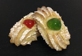 Traditional Italian amaretti biscuit shaped into swirls and topped with half of either a green or red glacé cherry. Perfect for every occasion.